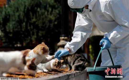 當?shù)貢r間4月9日,土耳其伊斯坦布爾,一名身穿防護服的市政工作人員在Sultanahmet廣場喂流浪貓。