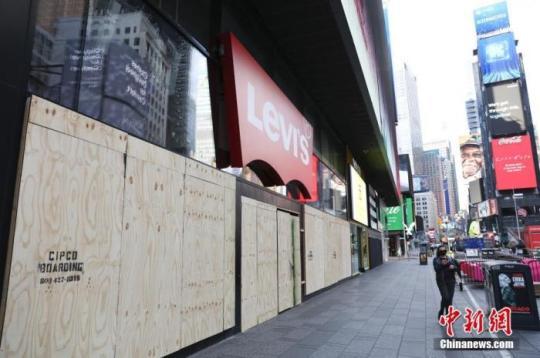 受新冠肺炎疫情影響,紐約時代廣場眾多商鋪用木板封閉大門。中新社記者 廖攀 攝