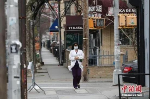 當(dāng)?shù)貢r(shí)間4月3日,紐約布魯克林,一名醫(yī)務(wù)工作者走向自己上班的醫(yī)院。中新社記者 廖攀 攝