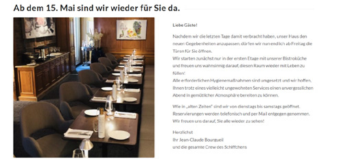 這不,隨著德國(guó)疫情趨緩、各州陸續(xù)復(fù)工復(fù)產(chǎn),北威州杜塞爾多夫的一家米其林餐廳Im schiffchen也按奈不住了。