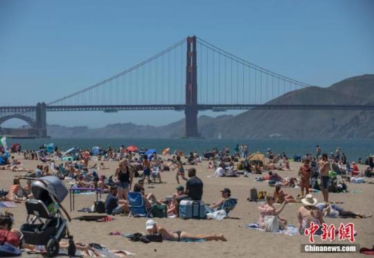 當(dāng)?shù)貢r間5月25日,美國舊金山市民在金門大橋附近的海灘納涼。 中新社記者 劉關(guān)關(guān) 攝