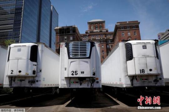 圖為在美國(guó)紐約曼哈頓貝爾維尤醫(yī)院附近,冷藏卡車臨時(shí)存放新冠肺炎死亡患者遺體。
