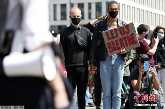 在柏林,數(shù)千名示威者5月30日在美國大使館外舉行了和平抗議,有人舉著“別再殺害我們”的標(biāo)語。在德甲足球聯(lián)賽賽場上,一位球員單膝下跪以示抗議,另有球員在球衣上寫下了“為喬治·弗洛伊德伸張正義”的標(biāo)語。