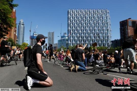 當(dāng)?shù)貢r間5月31日,英國倫敦,美國駐英大使館前,大批民眾跪在公路上抗議美國警察暴力執(zhí)法致非裔男子死亡事件。