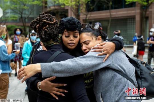 當(dāng)?shù)貢r間5月30日,加拿大多倫多警察總部外,幾名抗議者相互擁抱。