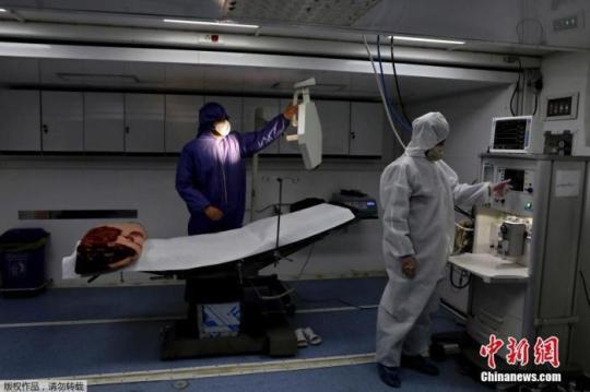 當(dāng)?shù)貢r間3月26日,伊朗德黑蘭國際展覽中心,穿防護(hù)服的工作人員在操作醫(yī)療設(shè)備。