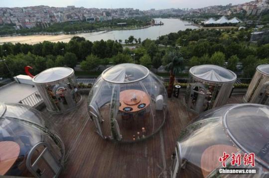 當(dāng)?shù)貢r(shí)間2020年6月16日,土耳其伊斯坦布爾,為保持用餐期間“社交距離”,一家餐廳設(shè)置了“圓頂”形狀的隔離用餐區(qū)。