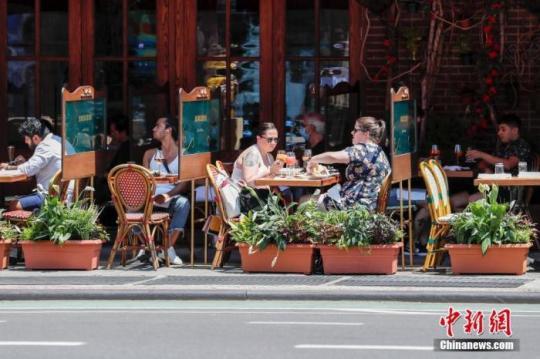當(dāng)?shù)貢r(shí)間6月22日,紐約曼哈頓一家餐廳,顧客在戶外用餐。當(dāng)日,紐約市按預(yù)定計(jì)劃進(jìn)入第二階段重啟,市政府預(yù)計(jì)將有約30萬人重返工作崗位。商場、影劇院、健身房等依然保持關(guān)閉。 中新社記者 廖攀 攝