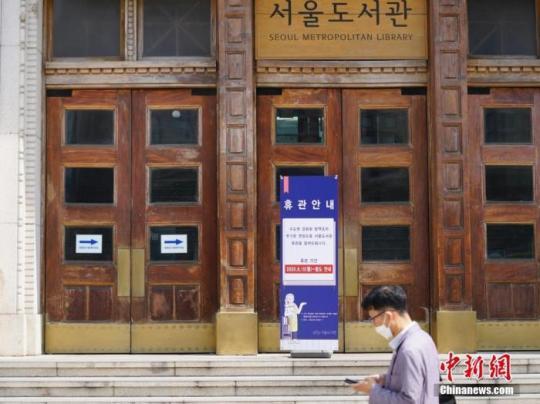 6月23日,一位韓國首爾市民經(jīng)過首爾市立圖書館門前,該圖書館貼出閉館通知。近來,包括韓國首爾、仁川、京畿道在內(nèi)的首都圈確診病例持續(xù)增加。 中新社記者 曾鼐 攝