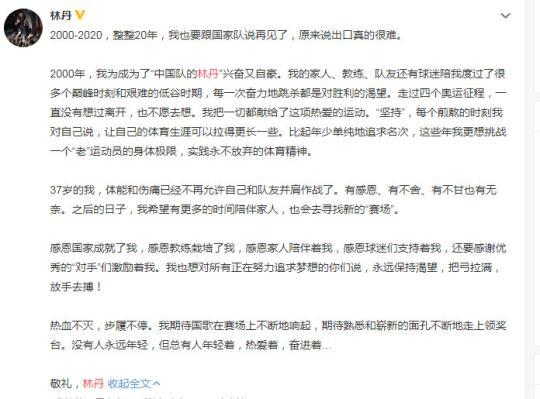 林丹正式宣布退役 結(jié)束20年職業(yè)生涯