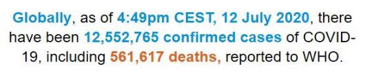 世衛(wèi)組織:全球新冠肺炎確診病例超過1255萬例