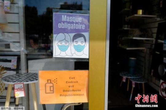 資料圖:圖為法國(guó)巴黎的一家商店里門前貼著戴口罩進(jìn)入標(biāo)識(shí)。