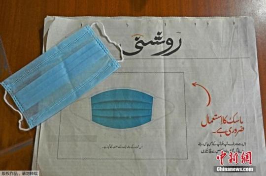 資料圖:當(dāng)?shù)貢r(shí)間7月23日,印控克什米爾斯利那加,一份當(dāng)?shù)貫鯛柖颊Z(yǔ)報(bào)紙“Roshni”為了提高人們對(duì)新冠肺炎的認(rèn)識(shí),向讀者免費(fèi)提供了口罩,并將其貼在頭版。