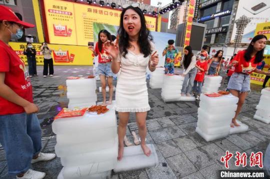 7月25日,湖南高溫天氣持續(xù),長沙黃興路舉辦站冰塊吃辣條挑戰(zhàn)賽,為市民們解暑去熱。比賽規(guī)定5分鐘時間內(nèi),選手赤腳站在冰塊上吃辣條最多者勝出,從而體驗“冰與火”的刺激。 楊華峰 攝