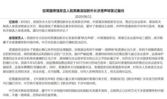 有記者問:8月9日,英國外交大臣與美澳加新外長發(fā)表聯(lián)合聲明,對(duì)香港實(shí)施國家安全法、推遲立法會(huì)選舉、取消有關(guān)候選人參選資格表達(dá)關(guān)切,稱這侵蝕了香港民眾基本權(quán)利自由、破壞了香港民主進(jìn)程,并呼吁香港政府盡早舉行選舉、恢復(fù)有關(guān)候選人參選資格。請(qǐng)問中國大使館有何評(píng)論?