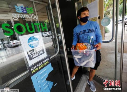 當?shù)貢r間8月30日,美國北卡羅萊納州教堂山,因新冠肺炎疫情持續(xù)擴大,北卡羅萊納大學(xué)學(xué)生遵守搬出校園宿舍的要求,整理行李搬出校園。