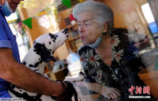 資料圖:當?shù)貢r間9月2日,西班牙巴塞羅那,一家養(yǎng)老院將老人推到玻璃窗前與前來探望的親朋好友見面。圖為一名老人隔窗親吻寵物狗。