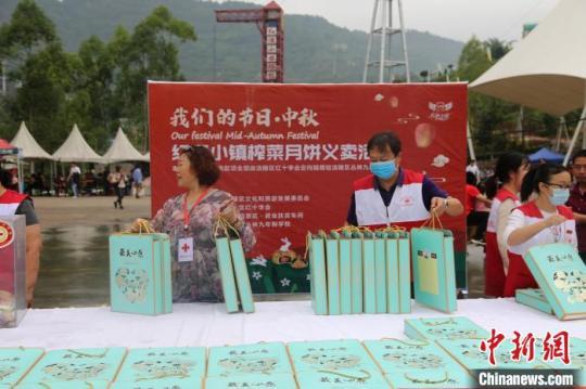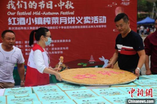 10月1日,中秋國慶假期,重慶涪陵榨菜月餅義賣活動在紅酒小鎮(zhèn)景區(qū)舉行,一個月餅售價為1元人民幣,吸引了不少民眾購買月餅奉獻(xiàn)愛心?;顒蝇F(xiàn)場,紅十字工作人員還用月餅擺了一個“歡度國慶”字樣。據(jù)悉,本次活動所有義賣款項(xiàng)全部由涪陵區(qū)紅十字會定向捐贈給涪陵區(qū)叢林九年制學(xué)校作為愛心助學(xué)金。