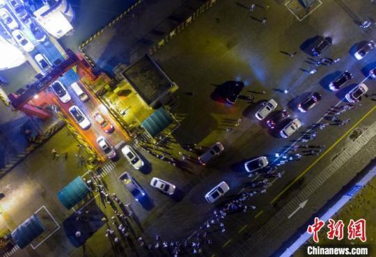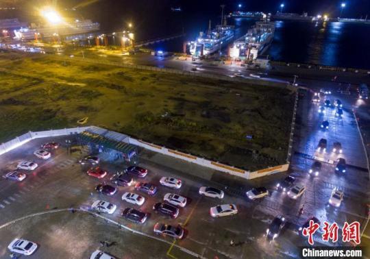圖為海南??谛潞8?,過海車輛排隊離港(航拍圖)。駱云飛 攝