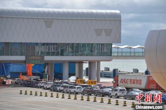 圖為廣東徐聞港碼頭,過海車輛有序登船?!●樤骑w 攝