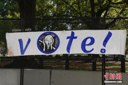 當(dāng)?shù)貢r間11月3日,美國迎來2020年大選投票日。圖為當(dāng)天在白宮圍墻外的一處橫幅。 中新社記者 陳孟統(tǒng) 攝