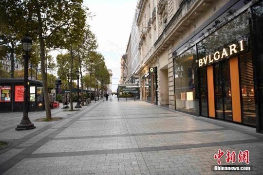 資料圖:當(dāng)?shù)貢r間10月30日,法國進(jìn)入第二次全國“封城”,以應(yīng)對新冠肺炎疫情惡化。圖為當(dāng)天巴黎香榭麗舍大街幾乎沒有行人,大多數(shù)店鋪關(guān)閉。 中新社記者 李洋 攝