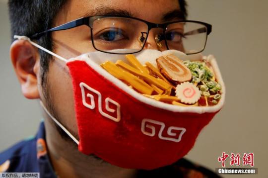 資料圖:當(dāng)?shù)貢r間9月23日,日本橫濱,日本設(shè)計師展示自制的“拉面口罩”??谡衷煨透】?,表面還有叉燒、筍絲、魚板等裝飾。