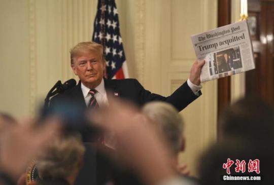 2020年2月6日,美國總統(tǒng)特朗普就彈劾案“無罪”裁決發(fā)表講話。中新社記者 陳孟統(tǒng) 攝