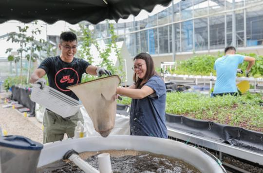 在廣東省江門市現(xiàn)代農(nóng)業(yè)綜合示范基地的蔬菜大棚里,嫩綠的水培蔬菜郁郁蔥蔥,從市場上常見的生菜、油麥菜、芹菜、黃瓜、南瓜、茄子、番茄,到一些特色稀少的品種,如魚腥草、檸檬羅勒、紫蘇,應(yīng)有盡有。水培裝置里的涓涓細(xì)流通過循環(huán)系統(tǒng),在水池與管槽間流轉(zhuǎn),水池里飼養(yǎng)的草魚、鯉魚、羅非魚等7種魚類時(shí)而躍出水面,爭相奪食,一派和諧共生的景象。