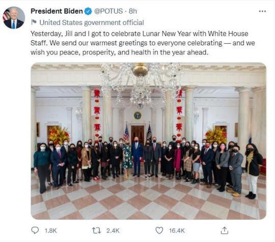 美國總統(tǒng)拜登發(fā)文慶祝農(nóng)歷新年:祝愿平安繁榮健康