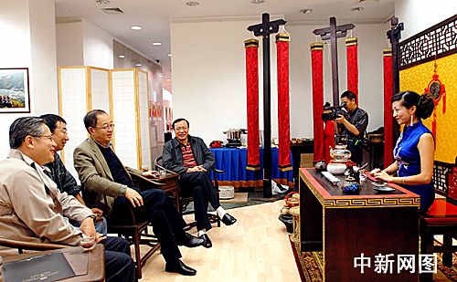 中新網(wǎng)紐約九月十三日電 中國(guó)國(guó)務(wù)院僑辦副主任、中國(guó)海外交流協(xié)會(huì)副會(huì)長(zhǎng)劉澤彭今天來(lái)到紐約亞洲文化中心,觀賞了正在這里舉行的云南茶藝表演。