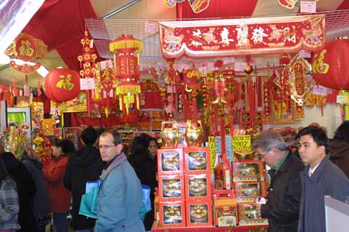 13區(qū)的幾條主要街道,像意大利大道、舒瓦齊大街及億富里大街等,以及13區(qū)政府所在的意大利廣場(chǎng),大街兩旁都掛起了由中法文組成的賀年標(biāo)語(yǔ)及象征喜慶的紅燈籠,透出濃濃的年味。在各個(gè)中國(guó)超市,都備齊了中國(guó)傳統(tǒng)食品和春聯(lián)等年貨。像陳氏商場(chǎng)和巴黎士多超市都推出了年貨專(zhuān)柜,有大紅燙金春聯(lián)、金童玉女、年畫(huà)、金豬、鞭炮、同心結(jié)、宮燈、金魚(yú)等裝飾品,也有風(fēng)味小吃、節(jié)日禮品等,吸引了眾多顧客。