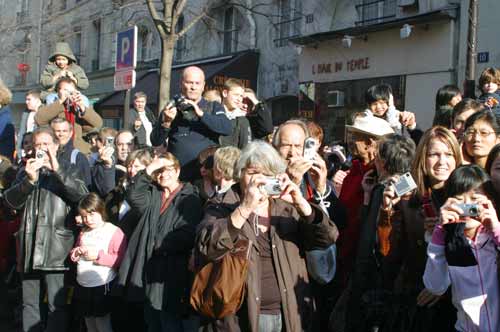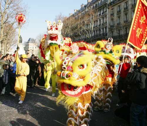 游行隊(duì)伍行經(jīng)的道路兩旁,擠滿了華人和法國觀眾,他們手上的照相機(jī)都在不停的拍照,法國電視3臺的攝像師也在忙著選取鏡頭。游行隊(duì)伍路過的華人商家,紛紛點(diǎn)燃了爆竹,以這種傳統(tǒng)方式“辭舊迎新”。