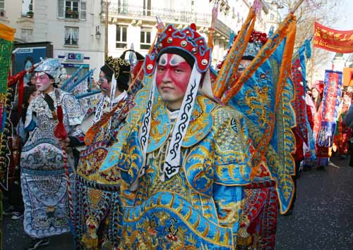 當(dāng)天下午,晴空萬里,陽光燦爛。趙進(jìn)軍大使、施月根參贊、巴黎3區(qū)區(qū)長埃登堡、華僑華人會主席林德標(biāo)等僑領(lǐng)走在了游行隊(duì)伍的最前頭。緊隨其后的是“金龍彩獅”,在歡快的鑼鼓聲中,跳躍翻騰;“仙女散花”、“財(cái)神拜年”沿途向觀眾派發(fā)“紅包”;腰鼓隊(duì)、扇子舞、彩傘舞,秧歌隊(duì)、彩旗隊(duì),走一路演一路;京劇戲服、少數(shù)民族服裝也在沿途展示著民族色彩;采高蹺的豬八戒、孫悟空上演取經(jīng)故事;身著功夫服的太極拳手,則在演繹著“推手”絕技。