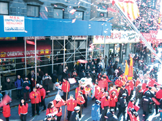 中國(guó)僑網(wǎng)消息:據(jù)美國(guó)《僑報(bào)》報(bào)道,紐約華埠新春醒獅大賀歲2月24日隆重登場(chǎng),逾15個(gè)武術(shù)館、社團(tuán)和體育會(huì)出動(dòng)祥獅、金龍?jiān)谔迫私执蠼中∠锎T(mén)子,討紅包。華埠處處鑼鼓喧天,好不熱鬧,吸引不少中外游客觀賞。
