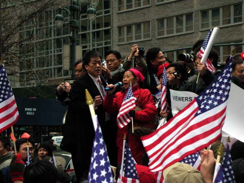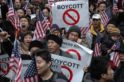 下午2時(shí),活動(dòng)單位首先在臨時(shí)搭建的指揮臺(tái)上升起美國(guó)國(guó)旗,播放美國(guó)國(guó)歌,隨后總指揮黃克鏘上臺(tái)講話,抗議CW11臺(tái)抹黑誣蔑中餐館的示威活動(dòng)正式開始。前來(lái)示威的人士來(lái)自紐約、費(fèi)城、華府、新州、賓州、麻省等地,他們手持美國(guó)國(guó)旗和抵制CW11臺(tái)傳單,高喊“反對(duì)種族岐視”、“反對(duì)捏造新聞”、“華人不可欺”、“CW11臺(tái)不專業(yè)”、“說(shuō)對(duì)不起”等口號(hào)。