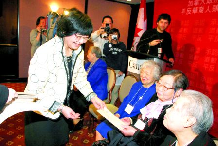 中國(guó)僑網(wǎng)消息:綜合加拿大《星島日?qǐng)?bào)》及《明報(bào)》報(bào)道,加拿大聯(lián)邦政府已展開(kāi)向“人頭稅”苦主遺孀的賠償工作,首批每張2萬(wàn)加元象征式補(bǔ)償金的支票已經(jīng)寄出。聯(lián)邦傳統(tǒng)及婦女地位部長(zhǎng)小田(Bev Oda)4月11日到多倫多出席儀式,把加拿大總理哈珀署名的道歉信親手交給5名“人頭稅”苦主遺孀。