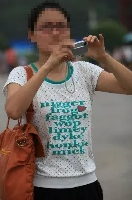 韓國某團體一名女性衣服,上面印有“HOES TAKE OFF YOUR CLOTHES”的字樣,由于Hoes又有Whore(妓女)的代稱之意,整句話的意思是“妓女,脫掉你的衣服”,小僑的尷尬癌要犯了……