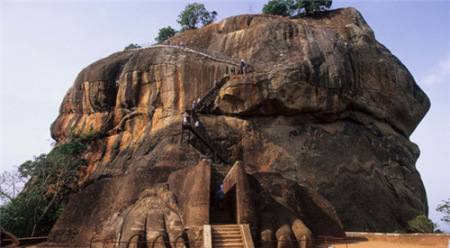 獅子巖是一座平地堀起的石山,海拔高度370米,傳說(shuō)斯里蘭卡古國(guó)王迦葉波一世在此處修建城堡。用石灰、磚和泥筑成的長(zhǎng)廊和臺(tái)階由巨獅口中延伸而出,人們可由此拾級(jí)而上前往錫吉里耶古城。錫吉里耶古城是斯里蘭卡古代文化寶庫(kù)中的藝術(shù)遺存。