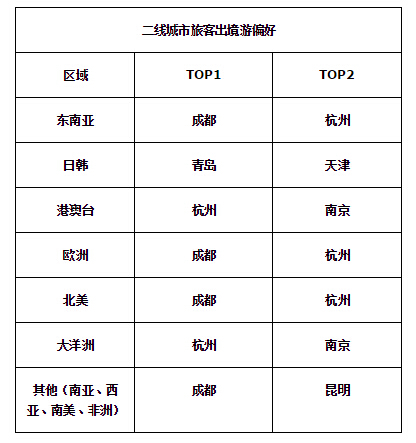 另一個有意思的現(xiàn)象是,二線城市旅客,對于出境游目的地的偏好各不相同。大體來說,杭州、南京旅客愛去港澳臺和大洋洲,成都旅客愛去歐美,青島與天津旅客偏愛日韓,昆明則是飛往南亞的主要客源地。