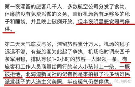 有滯留旅客提到,游客被困機(jī)場的第三天,天氣終于放晴,有不少國外的航班紛紛通知登機(jī),但很多中國乘客發(fā)現(xiàn),遲遲沒有輪到自己航班的信息。日本方面給出的答復(fù)是,先讓當(dāng)天(24日)的航班先飛,而之前滯留的22日和23日的乘客則并沒有明確的說法,日方給出的回復(fù)是,他們是根據(jù)航空公司的指令來操作的,這一解釋引起了滯留乘客的不滿。