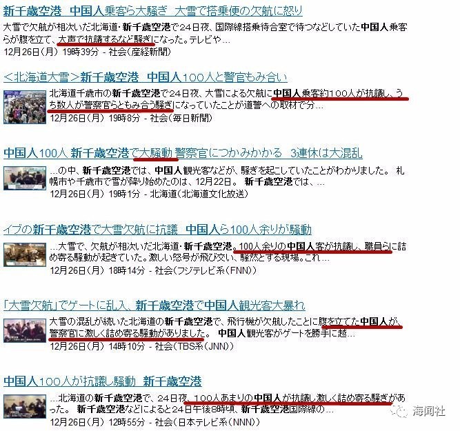 發(fā)現(xiàn)幾乎所有主流媒體(包括《產(chǎn)經(jīng)新聞》、《每日新聞》、富士電視臺、TBS電視臺等)的措辭都是“中國人抗議航空公司”“與警察發(fā)生沖突”“引起騷動”“互相推搡”。點(diǎn)開每條看,并未使用詆毀中國人的措辭。