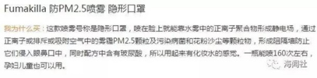 這款噴霧的包裝上,寫著可以防止PM2.5吸入。網(wǎng)上也有很多介紹: