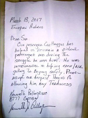 原本想著,自己會(huì)拿到一份證明。不料過了一會(huì)兒,他被工作人員喊了過去,曹紅國接受采訪時(shí)說:“機(jī)長說感謝我,說我救了所有人的命,保證所有的乘客和技術(shù)人員的安全。說他給我寫證明,也是一種義務(wù)?!庇浾邚闹泻焦I(yè)公眾號(hào)內(nèi)發(fā)布的信息看到,埃塞俄比亞航空公司的波音777飛機(jī)的機(jī)長寫了一封感謝信,里邊提及曹紅國在幫忙控制飛機(jī)上的暴徒時(shí)自己受傷?!八麑?duì)我們安全到達(dá)北京起了非常重要的作用,我們向他表示真摯的感謝?!?/p>