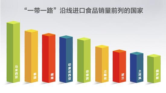 馬來西亞、泰國、越南、印度尼西亞、菲律賓、立陶宛、波蘭、土耳其、俄羅斯等“一帶一路”沿線國家的進口食品銷量位于前列。
