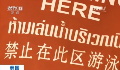 央視記者 陳林聰:我現(xiàn)在所在的位置就是普吉島的巴東海灘,也就是12號(hào)早上溺水的現(xiàn)場(chǎng)。在現(xiàn)場(chǎng)我們可以看到,海浪并不高,但是在岸邊我們依然能看到這樣的紅色警告旗子,提示游客這一區(qū)域并不適合游泳。這樣的旗子在沒有風(fēng)的情況下是無法看到上面的警告的,只有在有風(fēng)的情況下,或者打開旗幟的時(shí)候,才可以看到。上面有4種語言來表示禁止在這一區(qū)域游泳,(中間警告旗特寫畫面插入)像這樣的紅色的警告旗會(huì)在相隔50米的沙灘上被豎立起來。