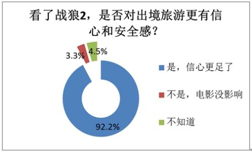 有92.2%的被調(diào)查表示,看了戰(zhàn)狼2,對(duì)出境旅游更有信心和安全感。只有3.3%的人選擇電影對(duì)自己沒有影響。
