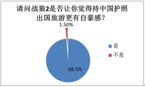 調(diào)查結(jié)果顯示,電影《戰(zhàn)狼2》的熱播不僅使得國(guó)人對(duì)中國(guó)護(hù)照的感情劇增,提升了作為“中國(guó)游客”的自豪感,也提升了國(guó)人出境旅游的信心。