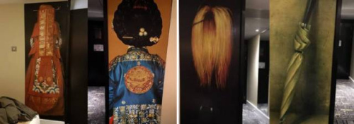 走廊的盡頭是酒店大堂,走廊邊竟然擺著一個很中國的、還焚著香火的神龕,而盡頭是燈光照射著一巨幅少女圖。