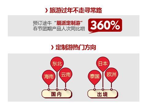 在消費(fèi)者愈發(fā)注重出游品質(zhì)的情況下,春節(jié)團(tuán)期定制出游需求猛增。截至目前,預(yù)訂途?!芭笈啥ㄖ朴巍?產(chǎn)品的人次相比去年增長了360%,用戶較為青睞的目的地國內(nèi)方向有海南、云南、東北,出境方向包括泰國、日本、歐洲等。